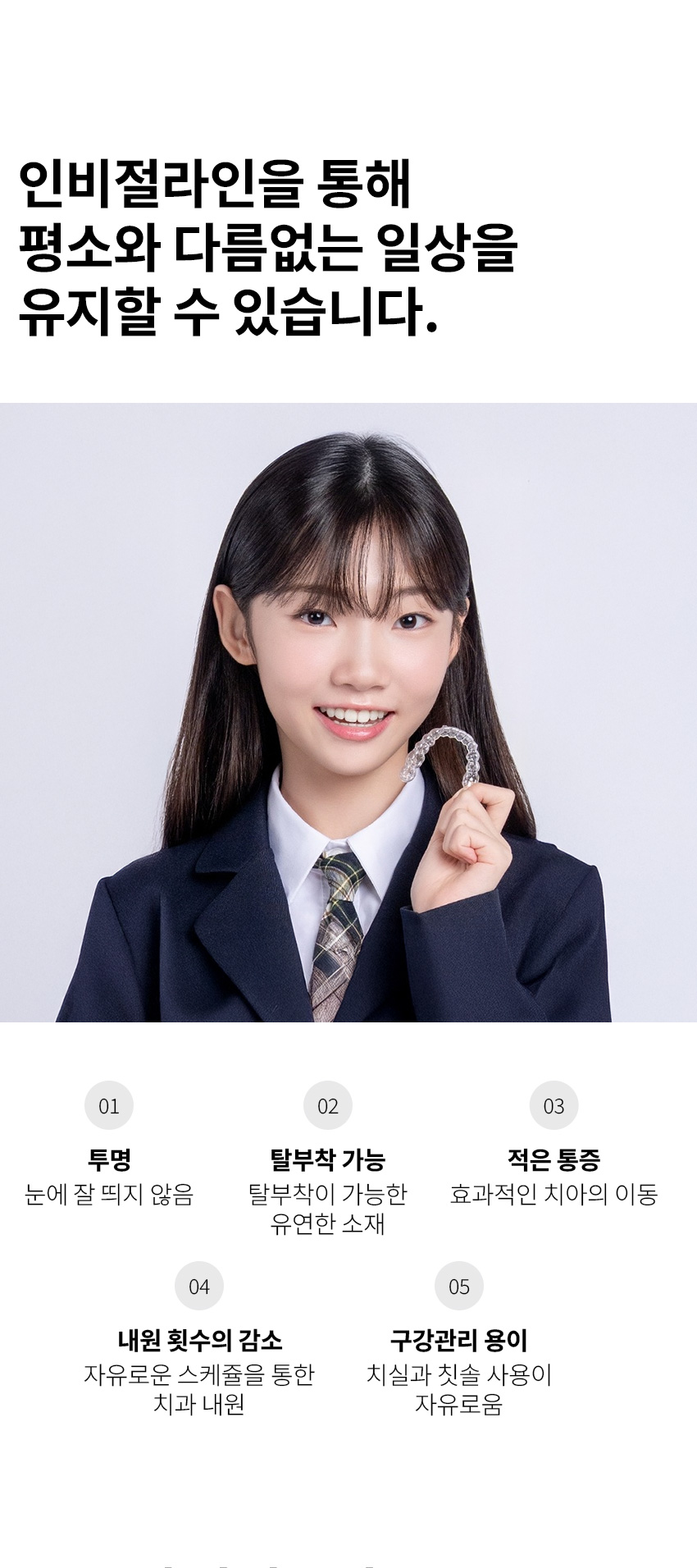- 입을 닫았을때 몇몇의 윗니가 아랫니 안쪽으로 들어가 있는 부분을 개선합니다.