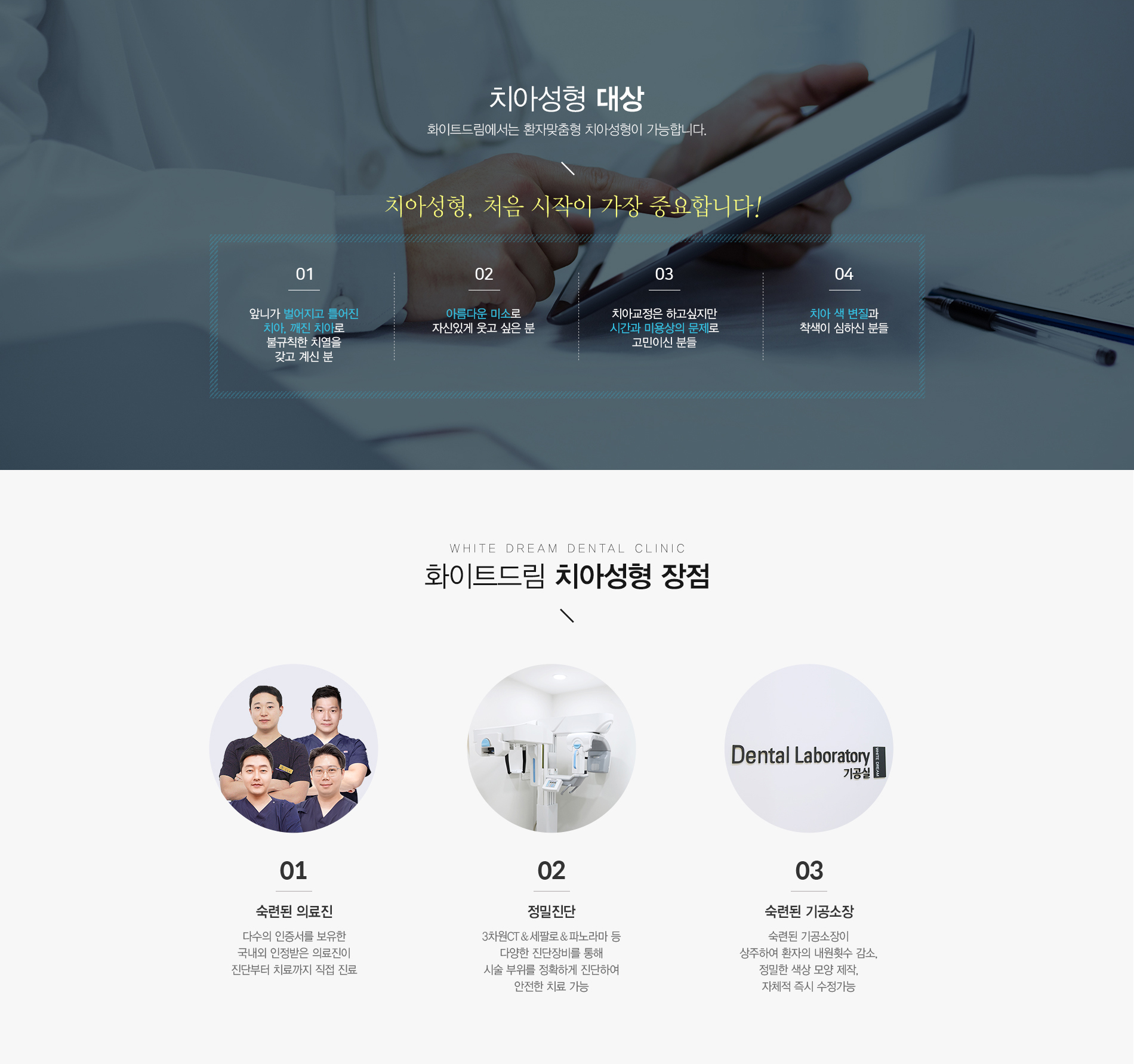 치아성형 WHITE DREAM DENTAL CLINIC 화이트드림 치아성형 치아성형은 얼굴만 성형하는 것이 아니라 자신의 이미지 개선을 위하여 치아도 성형하는 시대에 생긴 말입니다. 대표적인 치아성형에는 라미네이트, 올세라믹, 치아미백 등이 있으며, 앞니가 돌출되어 있거나 치아 사이가 벌어져 있는 경우, 탁한 치아색상을 가지고 있는 경우에 치아성형으로 치아문제를 해결할 수 있습니다.